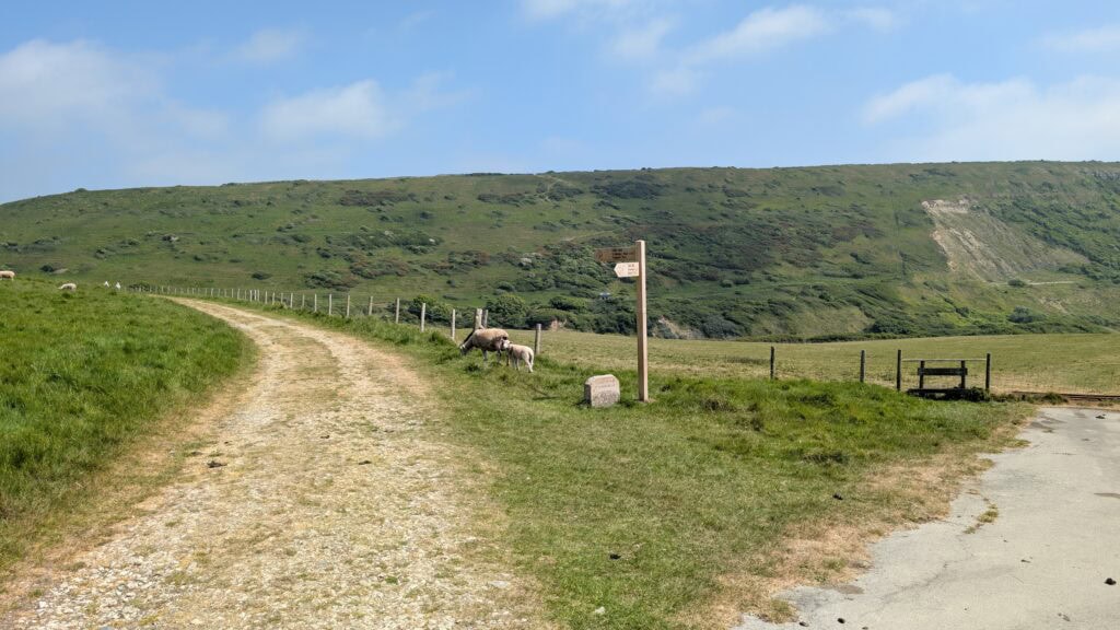 The gravel path descends sharply downhill until you reach a metal kissing gate. Again, follow the signpost for Chapman’s Pool, taking the well-worn grass path through the field across the bottom of the valley and over a wooden stile. Turn right when you connect with the tarmac path on the other side of the valley (again signposted).